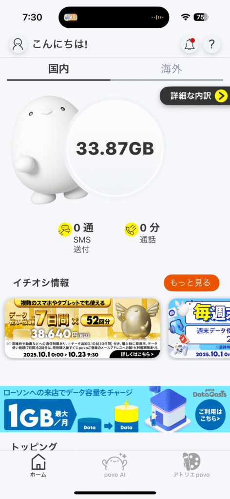 料金に関しては、それまで月6000円くらい通信費を払っていましたが、povoに乗り換えてから月2000円にまで抑えられています。年間にすると4万円の節約ですね。