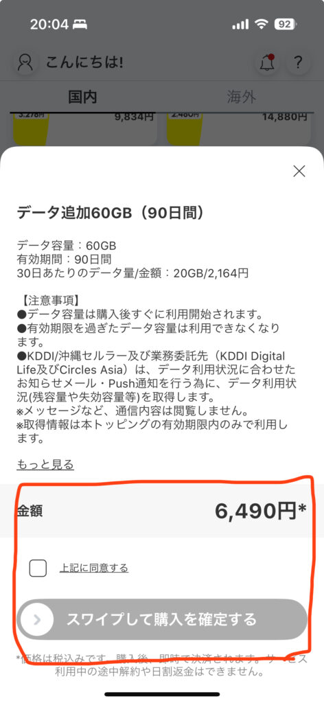 クレジットカードの登録が済んでいれば、スワイプするだけで購入できます。追加で別のプランを購入することもできるので、自分の生活スタイルに合ったプランを選ぶようにしましょう。