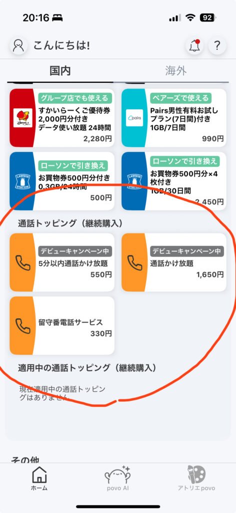 povoにはデータ通信の他に通話に関するプランも用意されています。